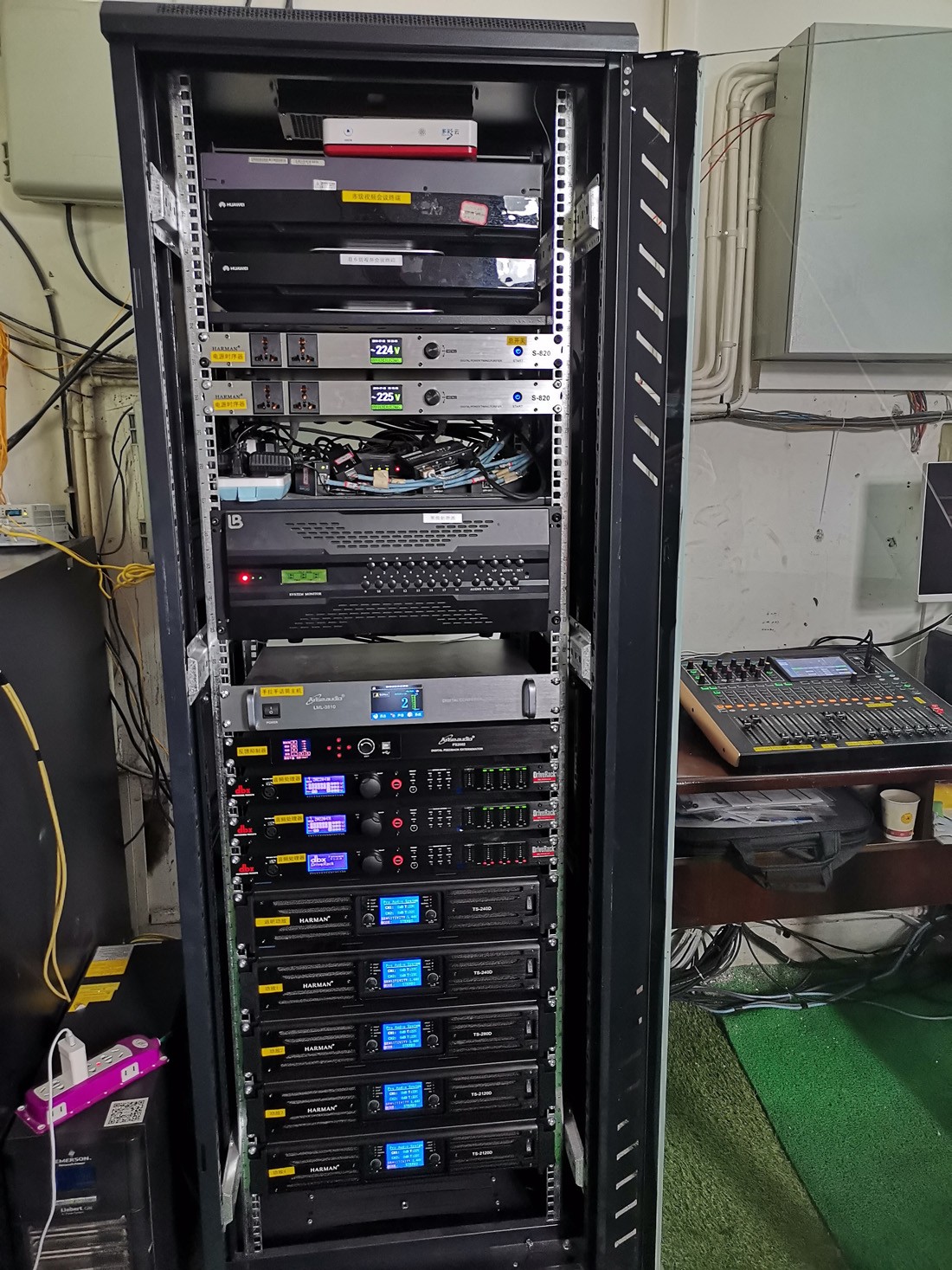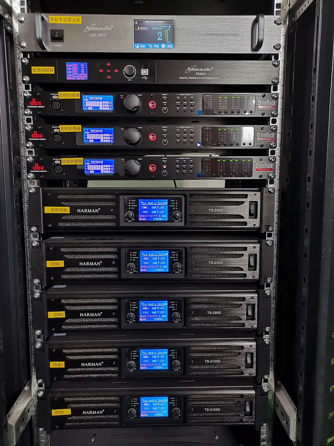 线性阵列中远程集中式发声,减少多点反射带来的声音乱杂(语音清晰度)。分段式扩声朝向近处糖心VLOG传媒网站免费进入声音小,朝越远声音逐渐加大。声音有方向感,中远程覆盖面广,前后排观众听到声音一样大(声场均匀度)。音响设备全系列HARMAN哈曼品牌。